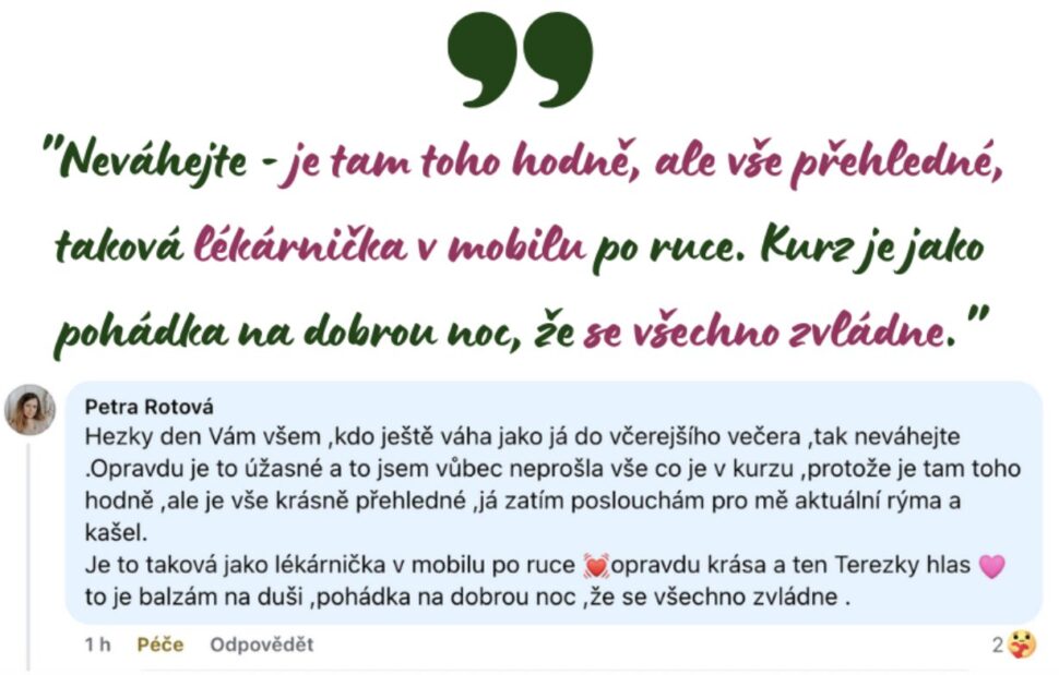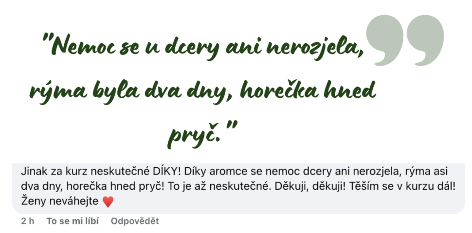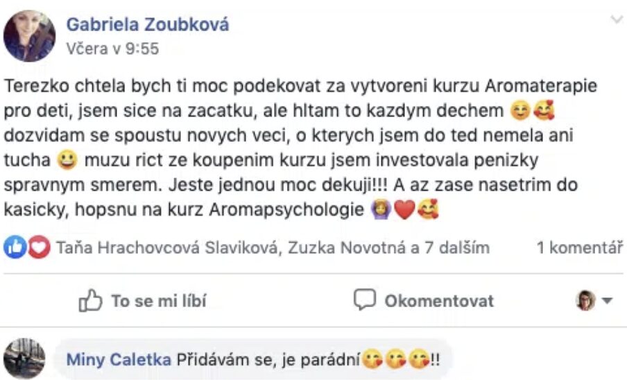 "Díky Terezce jsem opravdu začala aromaterapii používat bezpečně a jak dětem opravdu ulevit během nemoci. Zvládáme nemoci bez léků a máme jednodušší život díky mindfulness, které jsme začali praktikovat."