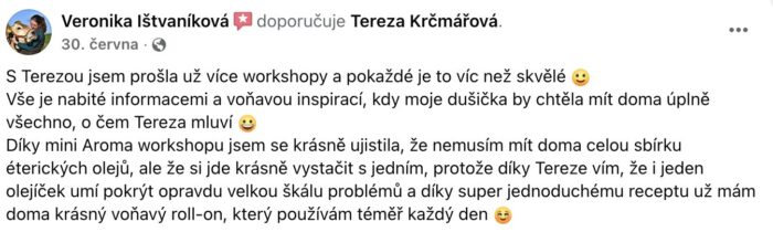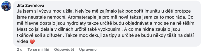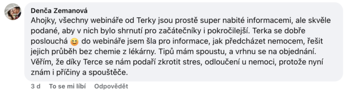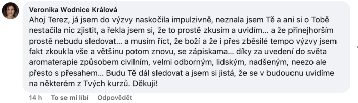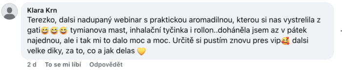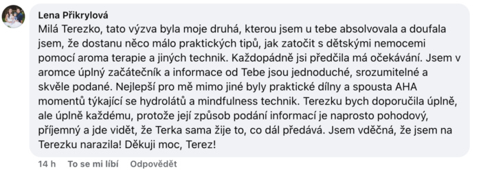 "Ty jsi mi opravdu při poslechu videí zvedla sebevědomí a už si tak nemyslím že jsem nějaká neschopná máma,manželka a hlavně žena kurz by se mi taky libil ale bohužel je to u nás složitější základ se myslím dozvěděla a udělala si zápisky. Díky Terez, jsi úžasná žena."