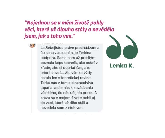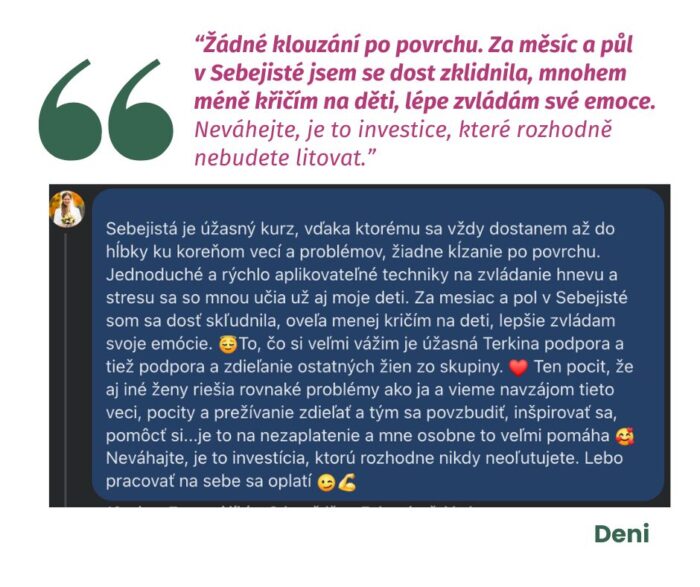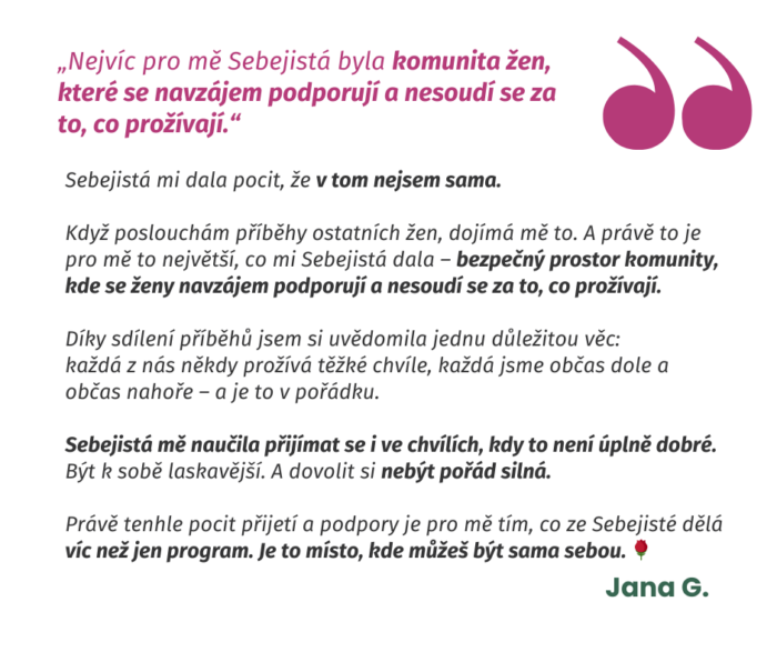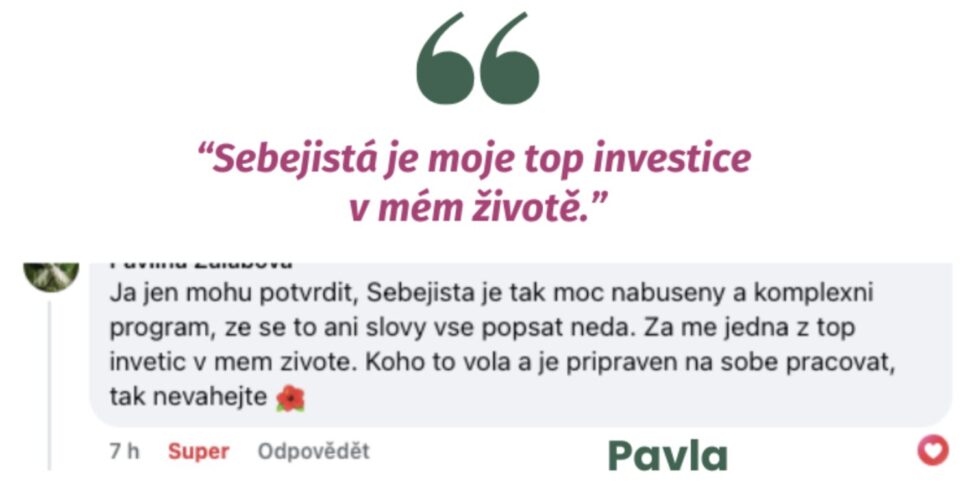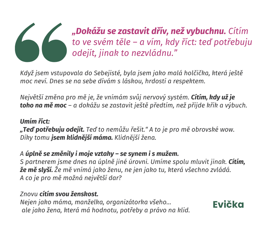 „Jediné, čeho dnes lituju, je, že jsem do Sebejisté nešla dřív. Ta změna v mém klidu a ve vztazích je obrovská.“