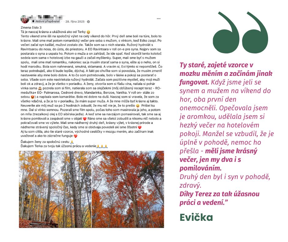 Nejsou to jen příběhy. Jsou to reálné výsledky žen, které začaly používat aromaterapii, mindfulness a somatické techniky, které tvoří základ Sebejisté 2.0