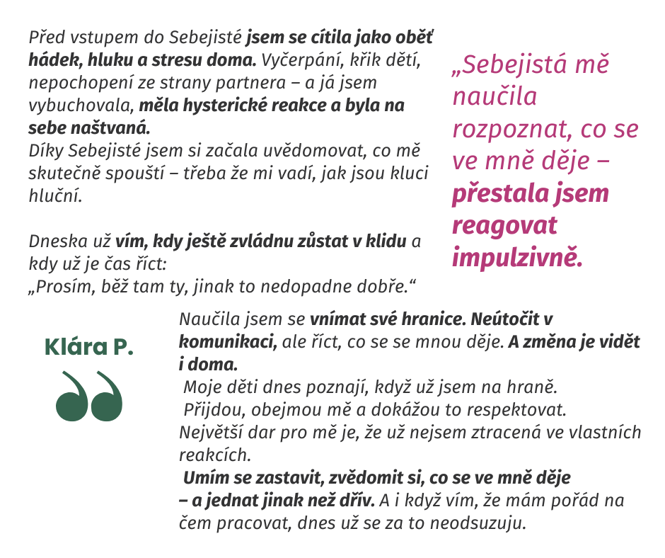 „Díky Sebejisté bych to doma už asi dávno vzdala. Tohle mi pomohlo zůstat – se sebou, s dětmi i v manželství.“