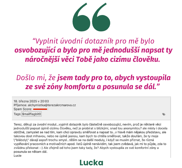 „Vnímám sebe, umím se zastavit. Cítím se mnohem líp, jistější, klidnější a i když vím, že je přede mnou ještě kus práce - vím, jak to žít, abych byla spokojená."